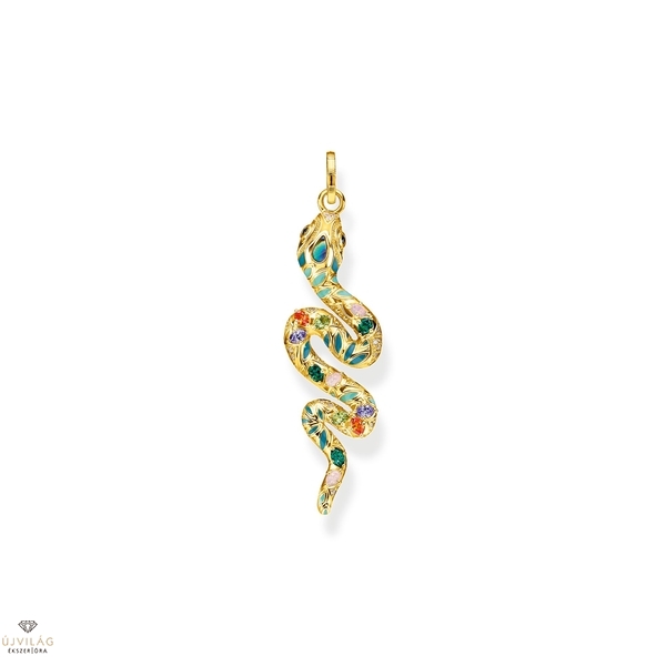 Az ősi mítoszokban és legendákban a kígyó mindig is a termékenység, az átalakulás és a gyógyulás emblémájaként szolgált. Ezt a szimbolikát tükrözi medálunk, amely egy fényes, arany színű kígyót tesz teljes képernyőre. A cirkónia pavéból és üvegkerámiából készült apró kövek zölden, narancssárgán, ibolyán és világos rózsaszínben csillognak. A kígyó fején, közel ahhoz a helyhez, ahol a kígyó medál egy hozzáillő lánccal kapcsolódik, titokzatosan csillog a gyöngyház. Magasság kb. 5,50 cm, Szélesség kb. 1,50 cm