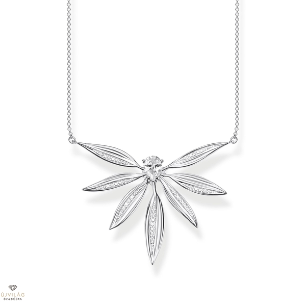 Egy ékszer minden különleges alkalomra: Ezt az extravagáns ezüst nyakláncot nőknek természetes levelek ihlették. A lánc medálját hét ezüst levél alkotja, amelyek csillogó fehér cirkóniával vannak bélelve. A szemet a közepén lévő nagy cseppmetszet és kézzel beállított kő vonja a közepébe. A finom vonalak és formák az 1960-as évek stílusát idézik, és minden modern ruhát csillogóvá varázsolnak. Magasság kb. 4,00 cm, Szélesség kb. 4,50 cm, Vastagság kb. 0,11 cm