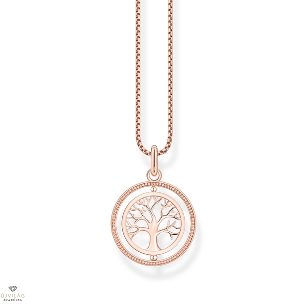 A természet ihlette: A Tree of Love dizájnú medállal ellátott nyaklánc az élet és a szerelem egyensúlyát jelenti. A kivágott, életfa motívumú medál igényesen kidolgozott, fehér cirkónia kövekkel kirakott, saját tengelye körül forgatható. A külső gyűrűt THOMAS SABO metszet díszíti. Az elülső és a hátsó díszek gazdagon részletezettek, így a medál mindkét oldalán hordható. Az ékszerkészlet kiváló minőségű 925 sterling ezüstből és 18 karátos rózsa aranyozásból készült. A medál levehető az állítható nyakláncról. A Szeretetfa ékszer kiváló ajándék kedvenc emberének. Magasság kb. 29,00 mm, Szélesség kb. 21,00 mm, Vastagság kb. 1,00 mm