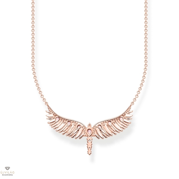 Női nyaklánc kicsi, stilizált főnix szárnyakkal 925 sterling ezüstből, 18 karátos rózsa arany bevonattal. Díszítés a részletek iránti szeretettel két szinten 51 kézzel beállított cirkónia kővel és drágakővel fehér és rozé színben. A nyaklánc hossza 40-45 cm között állítható Mitikus szimbolika: A női nyaklánc a mitikus főnix madár kis, stilizált szárnyaival, 925 sterling ezüstből készült, a részletekre is odafigyelve, és kiváló minőségű 18 karátos rózsa arany bevonattal van bevonva. A szárnytollak művészileg két szinten vannak kialakítva, és kézzel vannak beállítva 51 cirkónium kővel és drágakővel, fehér és rozé színben. A rozé színű, opál hatású kövek csiszoltak a csepp alakú gyémánt kivágáson belül. A fojtó egy hosszabbító lánccal van ellátva, aminek köszönhetően 40-45 cm között állítható a hossza. Egy különleges ember számára ez a rózsa aranyozott ékszer tökéletes ajándék – ideális a gyűrűvel, a fülbevalóval és a karkötővel egyforma kivitelben. Magasság kb. 22,00 mm, Szélesség kb. 37,00 mm, Vastagság kb. 1,00 mm