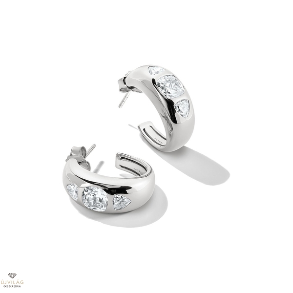 Ezek a Bold Elegance karika fülbevalók újrahasznosított 925-ös sterling ezüstből a kollekció modern, szobrászati formanyelvét tükrözik. Két fehér, csillogó cirkónia – az egyik párnás, a másik feltűnő trillió vágású – van beágyazva a lágyan lekerekített elülső részbe, és minden mozdulatnál visszatükrözik a fényt.