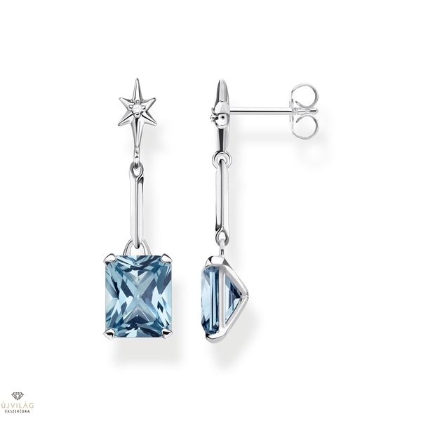 Grafikus fülbevaló akvamarin kékkel - klasszikus ékszerszín. A csiszolt nyolcszögletű vágás aláhúzza a szintetikus spinel drágakövek hatását. Maga a kőbeállítás minimálisra csökkent, így a kőlapok kisugárzása egy közepes hosszúságú ezüst elemen különösen intenzív fényvisszaverő hatással bír. Miniatűr csillagok díszítik a fülbevalót, és inspirálnak az éjszakai égbolthoz való társításukkal. Magasság kb. 3,20 cm, Szélesség kb. 1,00 cm