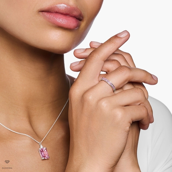 Kiváló minőségű 925 sterling ezüstből készült szíjgyűrű kőbeállítással Kézzel szett, rózsaszín cirkónia kövek szögletes hercegnős szabásban Alján THOMAS SABO gravírozással és finoman lekerekített gyűrűs testtel a nagyszerű viselési kényelem érdekében Időtlen elegancia: A női gyűrű kiváló minőségű 925-ös sterling ezüstből készült, alján THOMAS SABO gravírozással díszített. Kézzel állított cirkónia kövek négyzet alakú hercegnős szabásban, elbűvölő rózsaszín árnyalatban világítják meg. A nyitott csatorna beállítás javítja a kövek színeinek összjátékát, amikor a fény rájuk esik. A gyűrű szára finoman lekerekített, hogy viselése közben kényelmes legyen. A stílusos dizájn ideális társ a mindennapokhoz, és tökéletesen kombinálható a THOMAS SABO kollekció hasonló dizájnú ékszereivel. Szélesség kb. 4,00 mm
