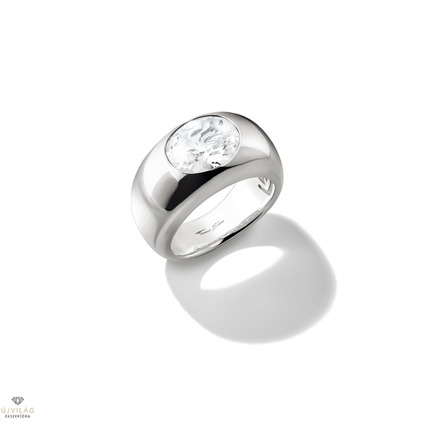 Egy figyelemfelkeltő gyűrű: az újrahasznosított 925-ös sterling ezüstből készült, lekerekített formájú darabot egy nagy, ovális csiszolású fehér cirkónia koronázza. A sima, letisztult foglalat modern és erőteljes módon emeli ki a követ, és egy csipetnyi csillogást kölcsönöz a gyűrűnek.