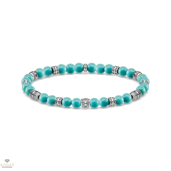 A tenger pozitív ereje – A türkizkék karkötő színével az óceánra emlékeztet. Ezenkívül a kőnek és a színnek gyógyító ereje van. Így az ékszer ideális ajándék az óceán szerelmeseinek és kedvenc embereinek. A csiszolt türkiz utánzatból készült drágakő gyöngyök feketített 925-ös sterling ezüstből készült díszített elemekkel váltakoznak. Négy különböző formában és mintával készültek az ikonikus THOMAS SABO Rebel at heart stílusban. Stretch karkötőként az egyedi karékszer könnyen felvehető és kényelmes viselet. Magasság kb. 5,00 mm