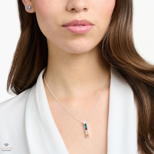 Női nyaklánc gravírozható medállal 925 sterling ezüstből. Szivárvány színű kövekkel díszítve. 40 és 45 cm között állítható hosszúságú levehető medál és nyaklánc készlet Szivárvány színei: A finom nyakláncon sok színben grafikus medál csillog. Kézzel kirakott hercegnős kövekkel. Az időtlen csatornabeállítás és az ékszer klasszikus formája stílusos, minimalista megjelenést kölcsönöz. A medál gravírozással személyre szabható. Az ékszerkészlet egy horgonyláncot is tartalmaz, amely 40-45 cm között állítható. Csakúgy, mint a levehető medál, ez is kiváló minőségű 925 Sterling ezüstből készült. Magasság kb. 27,00 mm, Szélesség kb. 4,00 mm, Vastagság kb. 1,00 mm