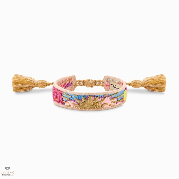 Ez a textilből készült, szőtt karkötő tökéletes kiegészítője egy fesztiválnak vagy a végtelen nyári éjszakák emlékének. A nap, a pálmafák és a kaktuszdíszek élénk színekben, például rózsaszínben, kékben, zöldben és aranyban pompáznak, életörömöt és fesztiválhangulatot árasztanak. Egy másik figyelemfelkeltő elem, amely mindenki figyelmét magára vonzza ezen a textil karkötőn, a tolózár extravagáns, aranyszínű szálakkal díszített rojtjai.