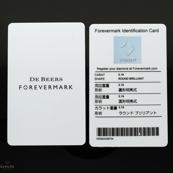 A Forevermark gyémántjainak szépségét és ritkaságát a kézi válogatás biztosítja; mindegyik gyémánt eredeti, kezeletlen és természetes. A világ összes gyémántjának alig 1 százaléka méltó a Forevermark névre. Ezenfelül minden Forevermark gyémánt felelős forrásból származik, körültekintően kiválasztott bányákból, melyek hasznot hoznak országuknak, az ott élő közösségeknek és embereknek is. A Forevermark minden egyes gyémántot végigkísér egész útján, és gondoskodik arról, hogy minden lépésnél a legszigorúbb üzleti, környezetvédelmi és társadalmi normák érvényesüljenek. Minden Forevermark gyémántba egy egyedi számot rejtenek, mely hármas ígéretet jelképez: a gyönyörű, ritka,felelős’forrásból származó gyémánt ígéretét. A szabad szemmel nem látható jelölés a Forevermark emblémájából és egy egyedi, csak Önnek szóló azonosító számból áll. Jöjjön el, tekintse meg a különleges mikroszkóp segítségével az Önnek érkezett gyémántot! A kép a termék fazonját mutatja, az ékszer formája a befoglalt gyémánt méretétől függően eltérhet. Kérésére az ékszert lefotózzuk és a fényképet elküldjük Önnek e-mailben.