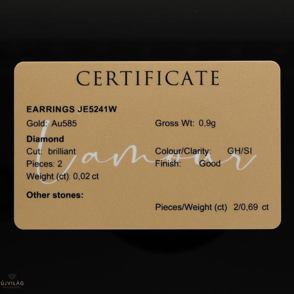 A webáruházunkban megtalálható összes drágaköves ékszer hivatalos forrásból származó, magyar fémjelzéssel ellátott, a terméklapon megadott finomságú termék. Minden egyes ékszer új, kifogástalan állapotú, melyre a hatályos jogszabályok szerinti garanciát vállalunk. A drágaköves ékszerek igényes díszdobozban kerülnek kiszállításra, hogy exkluzív élmény legyen a csomag kibontása.