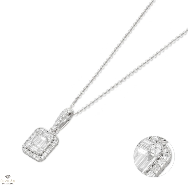 Elegáns és fényűző, ez a 18 karátos fehérarany nyakék számos bagett csiszolású gyémántot tartalmaz, amelyek lenyűgöző fókuszpontot adnak ennek a medálnak. Az összesen 0,42 karátos értékes drágakövek a központi bagett csiszolású gyémántokat foglalják magukban egy csillogó fényudvarban, majd kiterjesztik az óvadékot. Ezt a mindennapi viseletre tökéletesen alkalmas gyémánt szett medált egy biztonságos 18 karátos fehérarany lánc teszi teljessé.