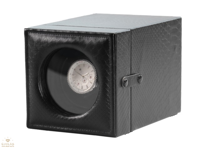 Fekete színű mesterséges kígyóbőr hatású óraforgató 1 órának. Kialakításának köszönhetően nagy méretű óráknak is megfelel! Belseje fekete színű. Hálózatról és AKKUMULÁTORRÓL egyaránt üzemel. 2 db AA (ceruzaelem) méretű akkumulátorról működik. Hálózati adapter tartozék! A forgató 4 percet forog jobb oldali irányba, majd 52 percet áll, ezután 4 percet forog bal oldali irányba, majd 52 percet áll. Méretei: Szélesség: 13,2 cm Magasság: 13,5 cm Mélység: 20 cm