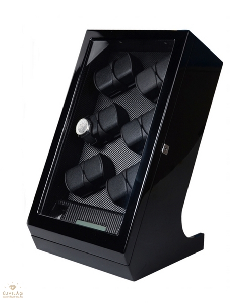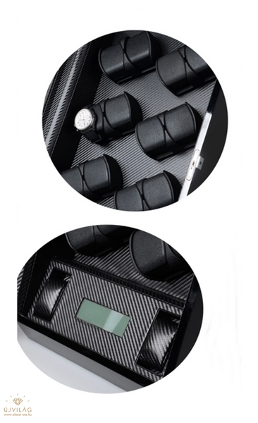 Magas fényű, több rétegben lakkozott fekete színű, fából készült óraforgató 12 órához. Kialakításának köszönhetően nagy méretű óráknak is megfelel! Belseje fekete színű, LCD kijelzős modell! Az LCD kijelző mellett további 2 db óra tárolására van lehetőség! A termék hálózatról és AKKUMULÁTORRÓL egyaránt üzemel. 6 db góliát méretű akkumulátorról működik. Zárható, 1db kulcs és hálózati adapter tartozék! A modell több programbeállítási lehetőséggel ellátva: Kiválaszthatjuk, hogy melyik fejegység milyen irányba (óramutató járásával megegyezően, ellentétesen, vagy éppen váltakozva) forogjon, valamint napi hány fordulatot tegyen meg (0-2200 fordulat). Egy fejegységen 2db órát tudunk forgatni (összesen 6 fejegység található). Méretei: Szélesség: 31,5cm Magasság: 56cm Mélység: 37cm Párnák szélessége: 55mm/db