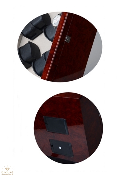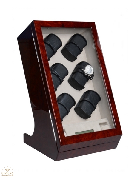 Magas fényű, több rétegben lakkozott rózsagyökér színű, fából készült óraforgató 12 órához. Kialakításának köszönhetően nagy méretű óráknak is megfelel! Belseje világos színű, LCD kijelzős modell! Az LCD kijelző mellett további 2 db óra tárolására van lehetőség! A termék hálózatról és AKKUMULÁTORRÓL egyaránt üzemel. 6 db góliát méretű akkumulátorról működik. Zárható, 1db kulcs és hálózati adapter tartozék! A modell több programbeállítási lehetőséggel ellátva: Kiválaszthatjuk, hogy melyik fejegység milyen irányba (óramutató járásával megegyezően, ellentétesen, vagy éppen váltakozva) forogjon, valamint napi hány fordulatot tegyen meg (0-2200 fordulat). Egy fejegységen 2db órát tudunk forgatni (összesen 6 fejegység található). Méretei: Szélesség: 31,5cm Magasság: 56cm Mélység: 37cm Párnák szélessége: 55mm/db