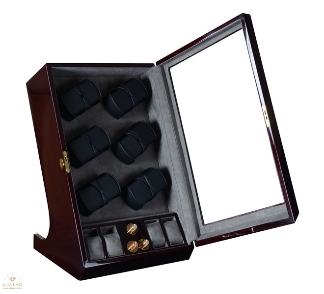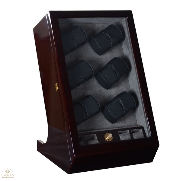 Több rétegben lakkozott mahagóni színű, fából készült óraforgató 12 órához. Kialakításának köszönhetően nagy méretű óráknak is megfelel! Belseje világos színű! A kapcsolók mellett további 4 db óra tárolására van lehetőség! A forgatófejek kettesével üzemeltethetőek! A termék hálózatról és AKKUMULÁTORRÓL egyaránt üzemel. 6 db góliát méretű akkumulátorról működik. Zárható, 1db kulcs és hálózati adapter tartozék! A modell több programbeállítási lehetőséggel ellátva: Óramutató járásával megegyezően, ellentétesen, vagy éppen váltakozva forogjon. Egy fejegységen 2db órát tudunk forgatni (összesen 6 fejegység található). Méretei: Szélesség: 31,5cm Magasság: 56cm Mélység: 37cm Párnák szélessége: 55mm/db