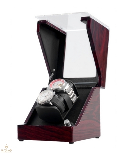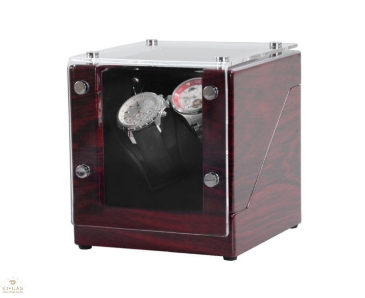 Magas fényű, több rétegben lakkozott rózsafa színű, fából készült óraforgató 2 órához. Kialakításának köszönhetően nagy méretű óráknak is megfelel! Belseje sötét színű. A termék hálózatról és AKKUMULÁTORRÓL egyaránt üzemel. 2 db C méretű akkumulátorról működik. Hálózati adapter tartozék! A modell több programbeállítási lehetőséggel ellátva Méretei: Szélesség: 17,5cm Magasság: 19cm Mélység: 19cm Párnák szélessége: 52mm/db