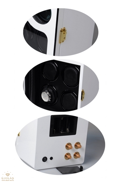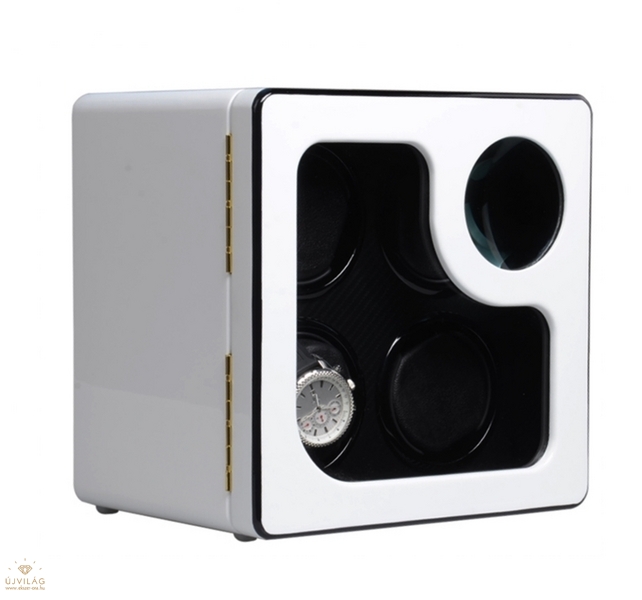 Magas fényű, több rétegben lakkozott fehér színű, fából készült óraforgató 4 órához. Kialakításának köszönhetően nagy méretű óráknak is megfelel! Belseje fekete színű. A termék hálózatról és AKKUMULÁTORRÓL egyaránt üzemel. 3 db Góliát akkumulátorról működik. Zárható, kulcs és hálózati adapter tartozék! A modell több programbeállítási lehetőséggel ellátva Méretei: Szélesség: 25cm Magasság: 26cm Mélység: 19cm Párnák szélessége: 65mm/db