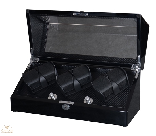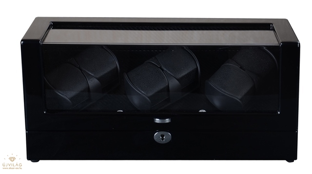 Több rétegben lakkozott fekete színű, fából készült óraforgató 6 órához. Kialakításának köszönhetően nagy méretű óráknak is megfelel! Belseje sötét színű. Hálózatról és AKKUMULÁTORRÓL egyaránt üzemel. Zárható, kulcs és hálózati adapter tartozék! A jobb oldali és a középső fej együtt, a bal oldali fej pedig külön irányítható! A modell több programbeállítási lehetőséggel ellátva: 1. Óramutató járásával megegyezően forog 3 percet, majd 28 percet pihen 2. Óramutató járásával ellentétesen forog 3 percet, majd 28 percet pihen 3. Óramutató járásával ellentétesen forog 2 percet, majd pihen 28 percet, ezután óramutató járásával megegyezően forog 2 percet, majd ismét 28 percet pihen 4. (Intenzív fokozat) Óramutató járásával megegyezően forog 10 percet, majd óramutató járásaval ellentétesen forog 10 percet, ezt ismétli egy órán keresztül, majd ezután 4 órát pihen Külső méretei: Szélesség: 42,5 cm Magasság: 20 cm Mélység: 17 cm