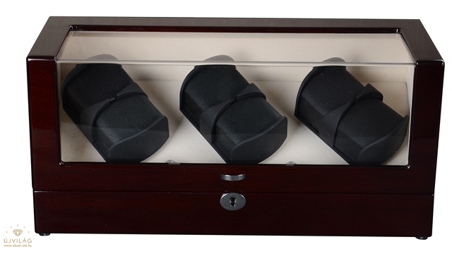 Több rétegben lakkozott mahagóni színű, fából készült óraforgató 6 órához. Kialakításának köszönhetően nagy méretű óráknak is megfelel! Belseje világos színű. Hálózatról és AKKUMULÁTORRÓL egyaránt üzemel. Zárható, kulcs és hálózati adapter tartozék! A jobb oldali és a középső fej együtt, a bal oldali fej pedig külön irányítható! A modell több programbeállítási lehetőséggel ellátva: 1. Óramutató járásával megegyezően forog 3 percet, majd 28 percet pihen 2. Óramutató járásával ellentétesen forog 3 percet, majd 28 percet pihen 3. Óramutató járásával ellentétesen forog 2 percet, majd pihen 28 percet, ezután óramutató járásával megegyezően forog 2 percet, majd ismét 28 percet pihen 4. (Intenzív fokozat) Óramutató járásával megegyezően forog 10 percet, majd óramutató járásaval ellentétesen forog 10 percet, ezt ismétli egy órán keresztül, majd ezután 4 órát pihen Külső méretei: Szélesség: 42,5 cm Magasság: 20 cm Mélység: 17 cm