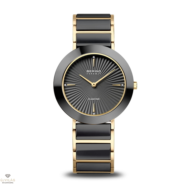 Ez a BERING Ceramic Diamond kollekcióból származó női óra lenyűgöző tisztasággal testesíti meg a luxus visszafogottságát. A mélyfekete, napraforgó mintázatú számlap vonzza a tekintetet – amelyet négy valódi gyémánt emel ki a 3, 6, 9 és 12 óra pozíciókban. Az arany színű tok melegséget és kontrasztot ad a csiszolt fekete kerámia kerethez, így a számlap könnyed eleganciával ragyog.