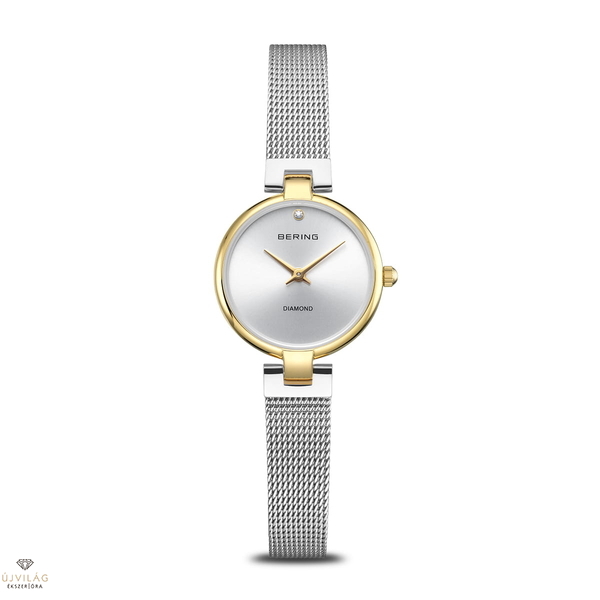 Kicsi, kifinomult, félreérthetetlenül BERING: ez a Classic kollekcióból származó női óra finom visszafogottságot ötvöz egy csipetnyi luxussal. A csiszolt arany rozsdamentes acél tok mérete 24 mm, és egy ezüst számlapot keretez, amelyet 12 óra pozícióban egy valódi gyémánt díszít – egy ragyogó kiemelés, amely magáért beszél.