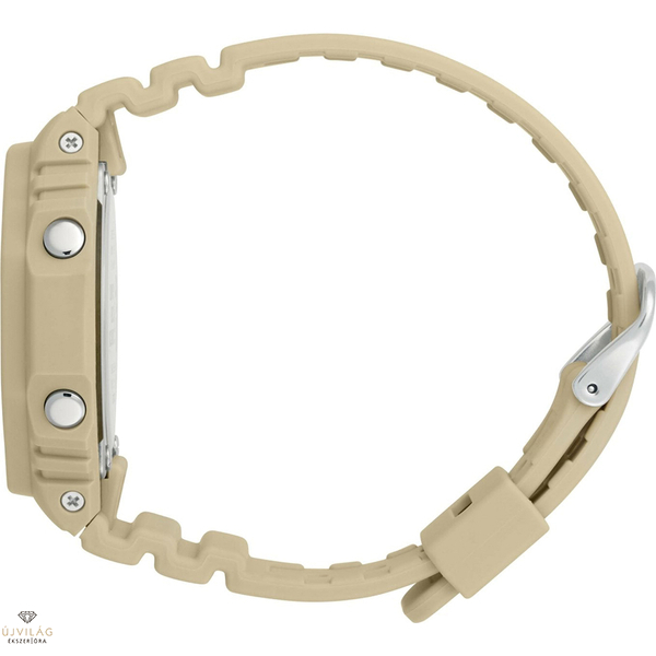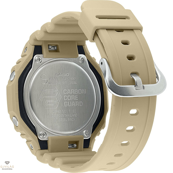 A Casio G-Shock GA-2100-5AER digitális óra nagyszerű, egyszerű kialakítású. Az óra vékony és világos bézs színű gyantatest, szénszálerősítéssel, 45,4 mm széles és 11,8 mm vastag. Az óra súlya 51 gramm. A GA-2100-5AER óra karosszériája az új Carbon Core Guard konstrukciót használja, amely kiváló ütésállóságot biztosít a szénszálak tulajdonságainak (ütésállóság, merevség és szétesési ellenállás) kihasználásával, amelyeket a repülőgép-alkatrészekben is használnak. A csuklópánt poliuretánból készült, ami nagyon tartós és kényelmes a csuklóján.
