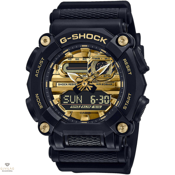 A Casio G-Shock Black & Gold GA-900AG-1AER stílusos megjelenésű férfi karóra. A Casio GA-900AG-1AER háza 49,5 mm széles és 16,9 mm vastag műanyagból. Az óra súlya 65 gramm. Ásványi üveg védi a számlapot. Az óra fekete műanyag hevederrel rendelkezik, amelynek rögzítési pontja 31 mm. Az óra vízállósági osztálya 200m / 20atm, azaz különösen vízálló (búvárkodásra alkalmas).