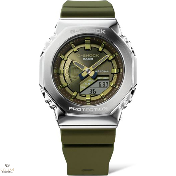 A Casio G-Shock fém borítású GM-S2100-3AER stílusos megjelenésű női karóra. A Casio GM-S2100-3AER óra 40,4 mm széles és 11 mm vastag váza IP-bevonatú műanyagból készült. Az óra súlya 55 gramm. Ásványi üveg védi a számlapot. Az óra zöld műanyag hevederrel rendelkezik, 23 mm szélességben a rögzítési ponttól. Az óra vízállósági osztálya 200m / 20atm, azaz különösen vízálló (búvárkodásra alkalmas).