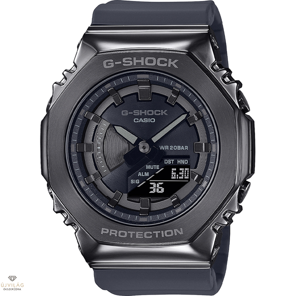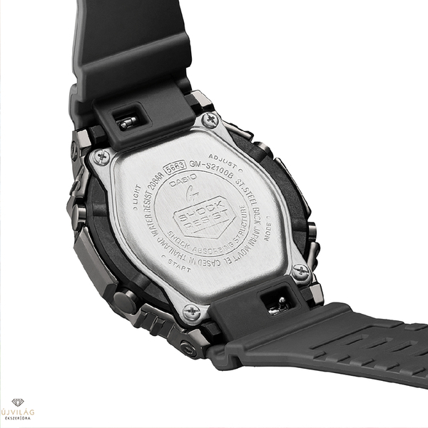 A Casio G-Shock fém borítású GM-S2100B-8AER stílusos megjelenésű női karóra. A Casio GM-S2100B-8AER óra 40,4 mm széles és 11 mm vastag váza IP-bevonatú műanyagból készült. Az óra súlya 55 gramm. Ásványi üveg védi a számlapot. Az óra fekete műanyag hevederrel rendelkezik, 23 mm szélességben a rögzítési ponttól. Az óra vízállósági osztálya 200m / 20atm, azaz különösen vízálló (búvárkodásra alkalmas).