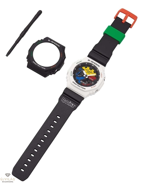 Örömmel jelentjük be a GAE-2100RC-t, amely a történelem egyik legkelendőbb játékán, az ikonikus Rubik-kockán alapul. A legkeresettebb G-SHOCK 2100-as sorozaton alapuló és a Rubik-kocka ihletésére épülő arculatfelújítás csak egy fordulatnyira van, és minden óra cserélhető előlappal és szerszámmal rendelkezik. A GAE-2100RC a legújabb karbonmagvédő technológiát tartalmazza. karcsúbb, kifinomultabb tok, amely egyedi nyolcszögletű keretével hódol a hőn szeretett retro megjelenésnek. Megtévesztően kompakt kialakítása ellenére ez az óra ugyanolyan tartós és strapabíró, mint bármelyik G-SHOCK, 200 méteres vízállósággal és ütésállósággal.