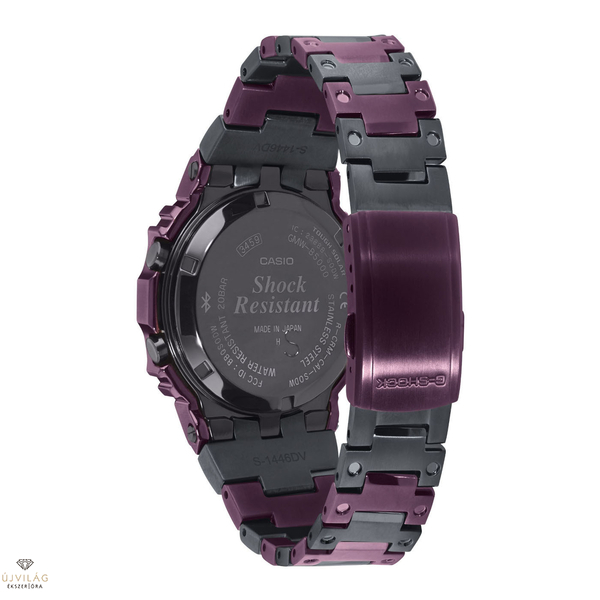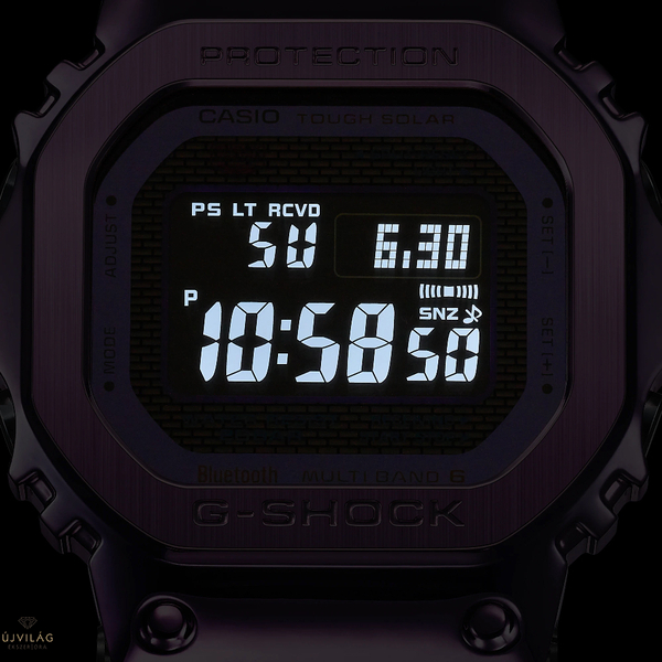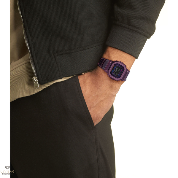 A Casio G-Shock Full Metal Purple IP Twilight Tokyo GMW-B5000PB-6ER Limited Edition a japán város, Tokió élénk neonszínvilágát kelti életre ebben a limitált kiadású G-SHOCK karórában. A rozsdamentes acél test és a csuklópánt ionbevonatú, így ütésálló. A digitális számlapot ásványi üveg védi. Az óra teste 43,2 mm széles és 12 mm vastag. A csuklópánt hossza 160-210 mm között állítható, a fülek távolsága pedig 14 mm. Az óra teljes tömege 73 g. Az óra 5 különböző riasztóval rendelkezik, pl. ébresztő és szundi, időzítő, telefon keresés funkció, akkumulátor töltöttségi szint jelző, energiatakarékos mód, visszaszámláló és automatikus naptár 2099-ig. Az akkumulátor 10 hónapig bírja.