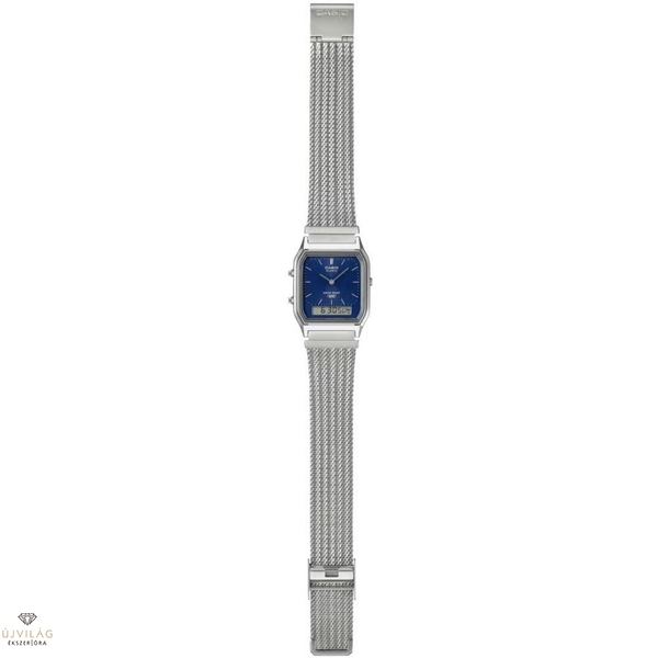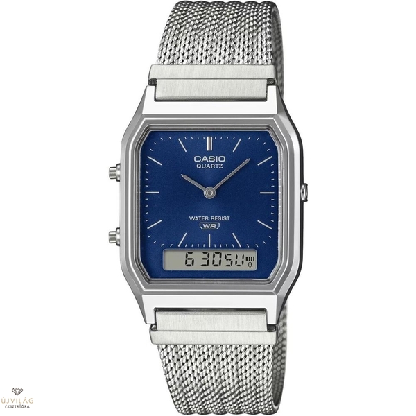 Egy kedvelt klasszikus újragondolt változata – az AQ-230 analóg-digitális kombinált óra szögletes számlapja a finom szövésű hálós szíjjal párosítva stílusos eleganciát sugároz.