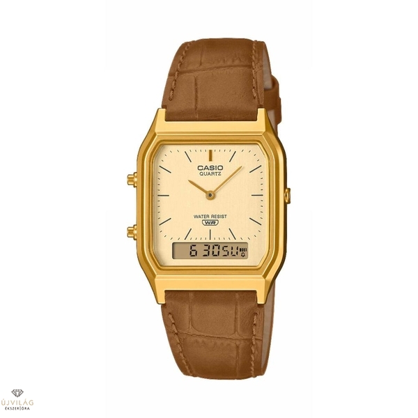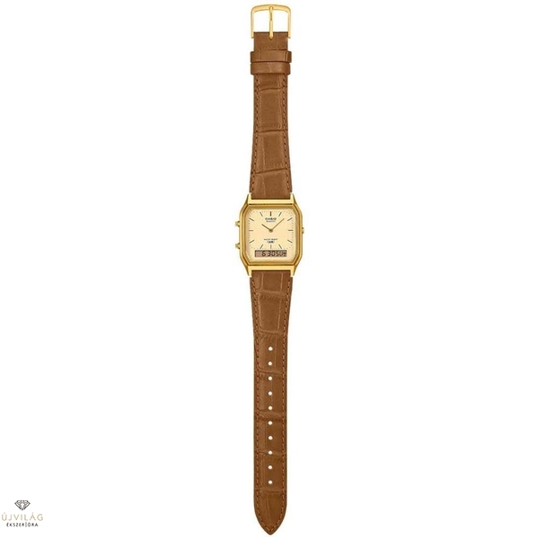 A népszerű AQ-230 modell alapján készült óra elegáns, kifinomult megjelenést, valamint praktikus funkcionalitást kínál, vízállósággal a mindennapi használathoz, stopperrel, riasztóval és egyéb funkciókkal. A klasszikus dombornyomott kialakítású szíj időtálló megjelenést kölcsönöz az órának.