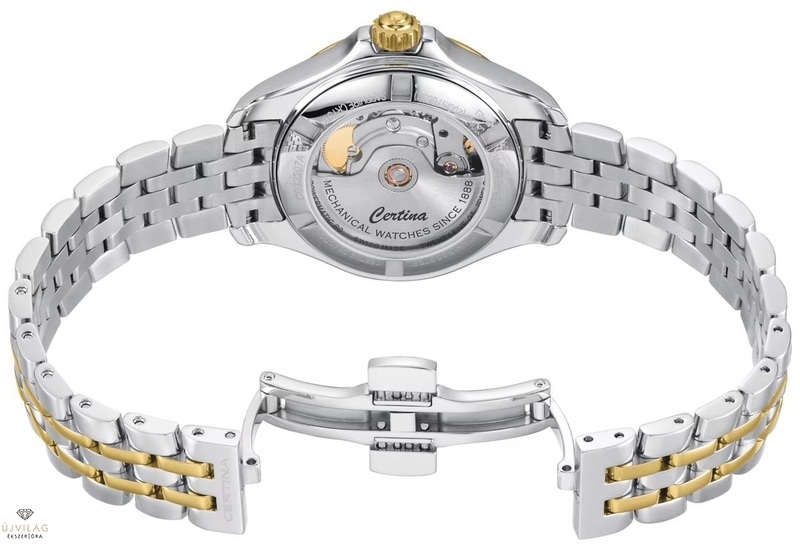 Ez az elegáns és nagy teljesítményű óra dinamikus stílusú nőknek készült. Automatikus Powermatic 80 mozgása lenyűgöző, 80 órás energia-tartalékkal rendelkezik, így nincs szükség napi felhúzásra. 34,5 mm-es rozsdamentes acél tokjában kivételes, 300 méteres vízállósággal büszkélkedhet. Átlátszó hátlapja révén megcsodálható a mechanizmus pontossága, míg a tükröződésmentes zafírkristály tökéletes olvashatóságot biztosít. Ez az óra ötvözi a Certina svájci kézművességét és kifinomult stílusát a mindennapi elegancia és teljesítmény érdekében.