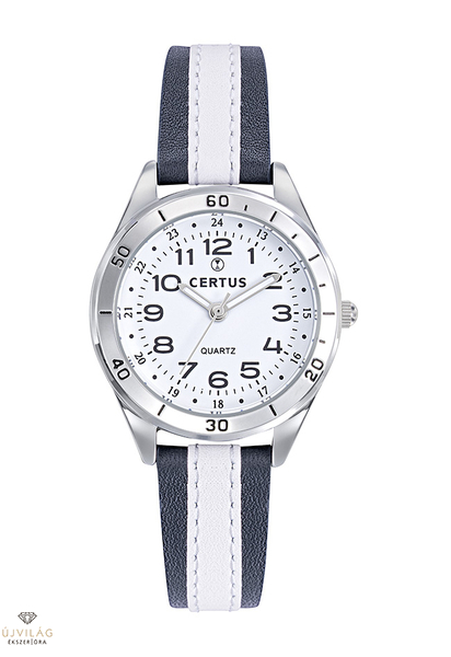 CERTUS Junior - ideális választás a legkisebbek első órájaként óratanuláshoz. Kék-fehér bőrszíjjal, hagyományos tüskezárral, ezüst színű fémötvözet tokban. A tok szélessége 31 mm, az óraszíj szélessége 14 mm, vastagsága 10 mm. Az üvege keményített ásványi üveg, mely ellenáll az enyhe surlódásoknak, azok nem hagynak rajta nyomot. Cseppálló szigeteléssel, ami kézmosáskor, esőben véd a vízcseppektől, de vízbe nem vihető!