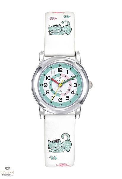 CERTUS Junior - ideális választás a legkisebbek első órájaként óratanuláshoz. Fehér színű bőr hatású műanyag szíjjal - zöld színű kawai macska mintával (japánul az aranyos macska figura) és virágokkal, halacskával, hagyományos tüskezárral, ezüst színű fémötvözet tokban. A tok szélessége 27 mm, az óraszíj szélessége 14 mm. Az üvege keményített ásványi üveg, mely ellenáll az enyhe surlódásoknak, azok nem hagynak rajta nyomot. Cseppálló szigeteléssel, ami kézmosáskor, esőben véd a vízcseppektől, de vízbe nem vihető!