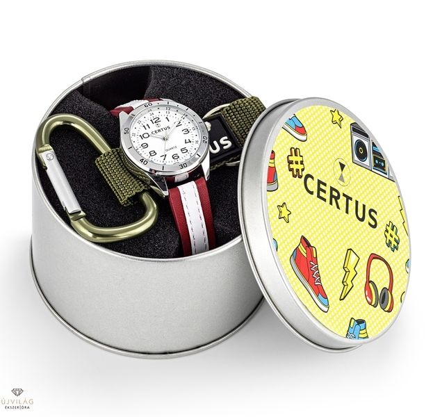 CERTUS Junior - ideális választás a legkisebbek első órájaként óratanuláshoz. Piros-fehér bőrszíjjal, hagyományos tüskezárral, ezüst színű fémötvözet tokban. A tok szélessége 31 mm, az óraszíj szélessége 14 mm, vastagsága 10 mm. Az üvege keményített ásványi üveg, mely ellenáll az enyhe surlódásoknak, azok nem hagynak rajta nyomot. Cseppálló szigeteléssel, ami kézmosáskor, esőben véd a vízcseppektől, de vízbe nem vihető! Ráadásként karabíneres kulcstartó jár az órához.
