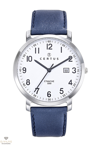A CERTUS francia óramárka elegáns és klasszikus stílusjegyekkel. Letisztult bőrszíjas karóra japán Miyota GM10 óraszerkezettel: dátumkijelzéssel a 3-as index mellett. Az óratok nemesacél, átmérője 39 mm. A kék színű bőrszíj szélessége 20 mm, zárszerkezete hagyományos tüskezár. Fehér számlappal, karakteres fekete színű óramutatókkal. Az üvege keményített ásványi üveg, mely ellenáll az enyhe súrlódásoknak, azok nem hagynak rajta nyomot. Az óra szigetelése 5 ATM, mely védi a szennyeződésektől, ráfröccsenő víztől, de vízben nem használható!