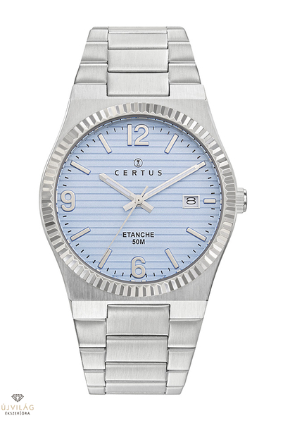 A CERTUS francia óramárka elegáns és klasszikus stílusjegyekkel. Az óratok nemesacél, átmérője 38 mm. Az ezüst színű nemesacél fémszíj szélessége 25 mm, biztonsági pillangó-zárral kapcsolódik. Japán Shiojiri VJ42 óraszerkezet: dátum-kijelzéssel a 3-as index mellett. Kék színű, mintázott számlappal és bordázott lünettel. Az üvege keményített ásványi üveg, mely ellenáll az enyhe súrlódásoknak, azok nem hagynak rajta nyomot. Az óra szigetelése 5 ATM, mely védi a szennyeződésektől, ráfröccsenő víztől, de vízben nem használható!