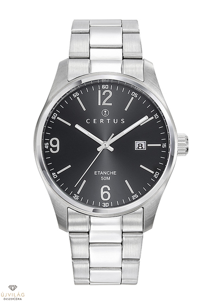 A CERTUS francia óramárka elegáns és klasszikus stílusjegyekkel. Az óratok nemesacél, átmérője 38 mm. Az ezüst színű nemesacél fémszíj szélessége 20 mm, biztonsági pillangó-zárral kapcsolódik. Japán Miyota 2115 óraszerkezet: dátum-kijelzéssel a 3-as index mellett. Elegáns fekete számlappal. Az üvege keményített ásványi üveg, mely ellenáll az enyhe súrlódásoknak, azok nem hagynak rajta nyomot. Az óra szigetelése 5 ATM, mely védi a szennyeződésektől, ráfröccsenő víztől, de vízben nem használható!