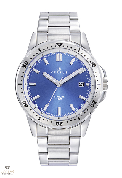 A CERTUS francia óramárka elegáns és klasszikus stílusjegyekkel. Sportos fémszíjas karóra divatos kék számlappal, fluoreszkáló óramutatókkal és indexekkel. Japán Miyota 2315 óraszerkezet: dátum-kijelzéssel a 3-as index mellett. Az óratok nemesacél, átmérője 40 mm. Az ezüst színű nemesacél fémszíj szélessége 20 mm, biztonsági pillangó-zárral kapcsolódik. Az üvege keményített ásványi üveg, mely ellenáll az enyhe súrlódásoknak, azok nem hagynak rajta nyomot. Az óra szigetelése 10 ATM, mely védi a szennyeződésektől, víztől, de a bőrszíja nem vízálló, ezért így úszásra, vízi sportolásra nem alkalmas!
