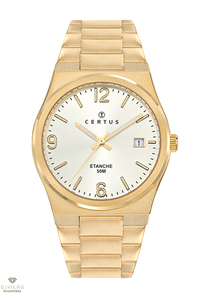 A CERTUS francia óramárka elegáns és klasszikus stílusjegyekkel. Az óratok nemesacél, átmérője 38 mm. A sárga arany színű nemesacél fémszíj szélessége 25 mm, biztonsági pillangó-zárral kapcsolódik. Japán Shiojiri VJ42 óraszerkezet: dátum-kijelzéssel a 3-as index mellett. Krém színű, pezsgő árnyalatú számlappal. Az üvege keményített ásványi üveg, mely ellenáll az enyhe súrlódásoknak, azok nem hagynak rajta nyomot. Az óra szigetelése 5 ATM, mely védi a szennyeződésektől, ráfröccsenő víztől, de vízben nem használható!
