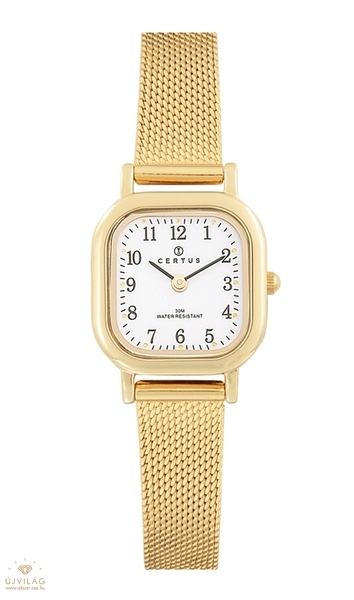 A CERTUS francia óramárka elegáns és klasszikus stílusjegyekkel. A tok sárga arany színű IPG bevonattal ellátott réztok, átmérője 23 mm. A sárga arany színű nemesacél szövött fémszíj szélessége 12 mm, mely biztonsági zárral kapcsolódik. Az üvege keményített ásványi üveg, mely ellenáll az enyhe súrlódásoknak, azok nem hagynak rajta nyomot. Japán Miyota szerkezet garantálja a megbízható pontosságot. Az óra szigetelése 3 ATM cseppálló, mely a kézmosáskor, esőben esetlegesen ráfröccsenő cseppektől véd, de vízbe nem vihető!