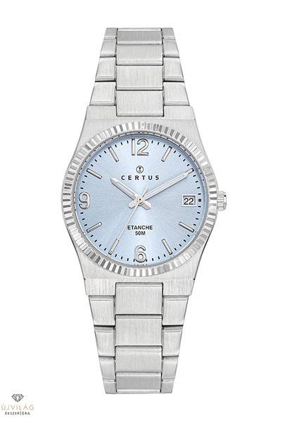 A CERTUS francia óramárka elegáns és klasszikus stílusjegyekkel. Divatos kék számlapos karóra japán Shiojiri VJ32 óraszerkezettel: dátumkijelzéssel a 3-as indexnél. Az óratok nemesacél, átmérője 30 mm. Stílusos bordázott lünettel. A nemesacél fémszíj szélessége 20 mm, mely biztonsági pillangó-zárral kapcsolódik. Az üvege keményített ásványi üveg, mely ellenáll az enyhe súrlódásoknak, azok nem hagynak rajta nyomot. Az óra szigetelése 5 ATM, mely védi a szennyeződésektől, ráfröccsenő víztől, de vízben nem használható!