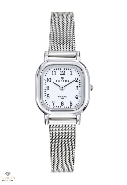 A CERTUS francia óramárka elegáns és klasszikus stílusjegyekkel. A tok ezüst színű IPS bevonattal ellátott réztok, mérete 23x23 mm. A nemesacél fémszíj biztonsági zárral kapcsolódik, szélessége 12 mm. Japán Miyota GL22 óraszerkezet garantálja a megbízható pontosságot. Az üvege keményített ásványi üveg, mely ellenáll az enyhe súrlódásoknak, azok nem hagynak rajta nyomot. Az óra szigetelése 3 ATM cseppálló, mely a kézmosáskor, esőben esetlegesen ráfröccsenő cseppektől véd, de vízbe nem vihető!