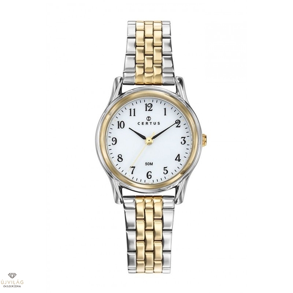 A CERTUS francia óramárka elegáns és klasszikus stílusjegyekkel. A tok ezüst és arany színű IPS és IPG bevonattal ellátott fémötvözet, átmérője 28,5 mm. A bikolor nemesacél fémszíj szélessége 14 mm, mely biztonsági zárral kapcsolódik. Az üvege keményített ásványi üveg, mely ellenáll az enyhe súrlódásoknak, azok nem hagynak rajta nyomot. Japán Miyota 2035 szerkezet garantálja a megbízható pontosságot. Az óra szigetelése 5 ATM, mely védi a szennyeződésektől, ráfröccsenő víztől, de vízben nem használható!
