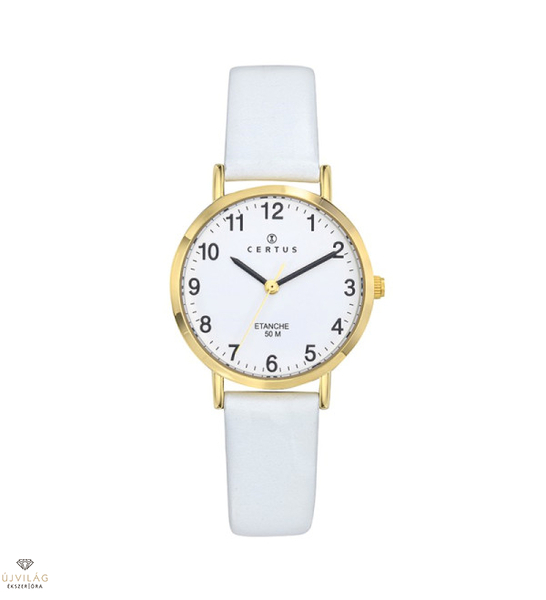 A CERTUS francia óramárka elegáns és klasszikus stílusjegyekkel. A tok sárga arany színű IPG bevonattal ellátott réztok, átmérője 30 mm. A bőrszíj szélessége 14 mm, zárszerkezete hagyományos tüskezár. Japán Shiojiri VJ21 óraszerkezet garantálja a megbízható pontosságot. Az üvege keményített ásványi üveg, mely ellenáll az enyhe súrlódásoknak, azok nem hagynak rajta nyomot. Az óra szigetelése 3 ATM cseppálló, mely a kézmosáskor, esőben esetlegesen ráfröccsenő cseppektől véd, de vízbe nem vihető!
