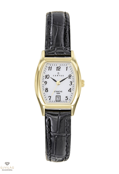 A CERTUS francia óramárka elegáns és klasszikus stílusjegyekkel. Elegáns bőrszíjas karóra japán Miyota GL12 óraszerkezettel: dátumkijelzéssel a 6-os index felett. A szögletes óratok sárga arany IPG bevonattal ellátott réztok, mérete 22x12 mm. A fekete színű bőrszíj szélessége 12 mm, zárszerkezete hagyományos tüskezár. Az üvege keményített ásványi üveg, mely ellenáll az enyhe súrlódásoknak, azok nem hagynak rajta nyomot. Az óra szigetelése 3 ATM cseppálló, mely a kézmosáskor, esőben esetlegesen ráfröccsenő cseppektől véd, de vízbe nem vihető!