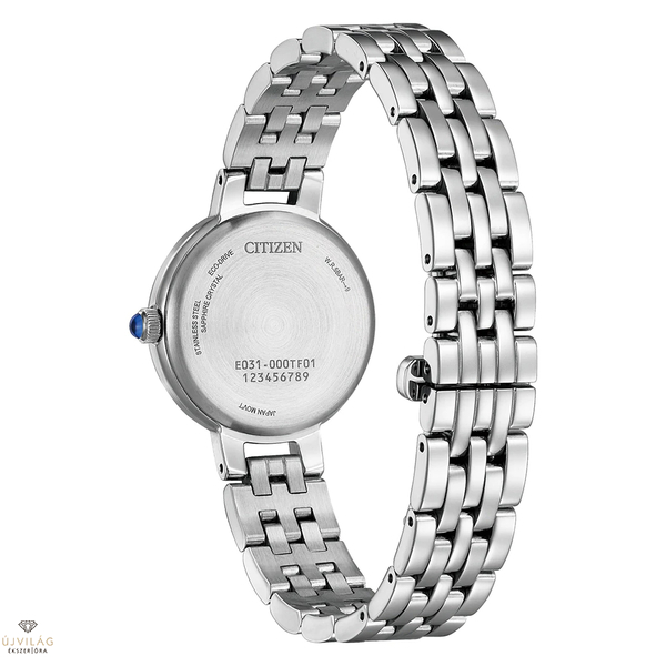 Az Eco-Drive E031 kaliberű óra akkumulátor-kifogyás jelzővel és akár 180 napos energia-tartalékkal rendelkezik – nincs szükség akkumulátor cserére. A karcálló zafírüveg védi a számlapot, míg a masszív rozsdamentes acél szíj dupla nyomógombos csatjával biztosítja a biztonságos viseletet.