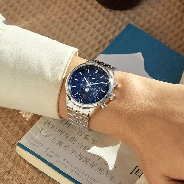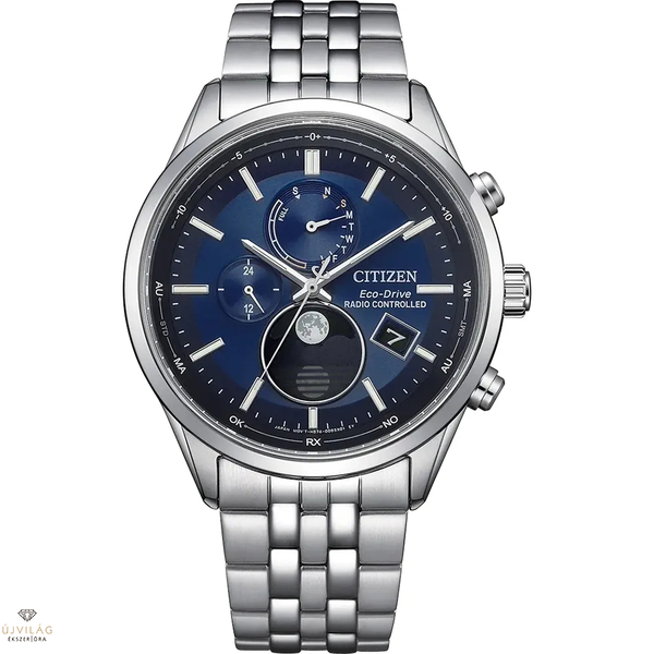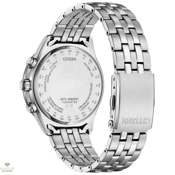 A szilárd tok, amelynek átmérője 42 mm, magassága 10,72 mm, védi a kék számlapot, amelyen világos vonalindexek találhatók. Az innovatív Eco-Drive kaliberrel felszerelt óra akár 180 napos energia-tartalékkal és 2,5 éves sötét tartalékkal rendelkezik – anélkül, hogy elemet kellene cserélni. Funkciói között szerepel a világidő, a holdfázis-kijelzés, az örök naptár, az automatikus mutatókorrekció és a rádióvezérelt óra Európa, az USA, Kína és Japán számára. Az antimágneses technológia és az ütésérzékelő biztosítja a tartósságot és a megbízhatóságot. A karcálló zafírüveg és a 10 bar-ig vízálló szerkezet teszi teljessé a kiváló minőségű összképet. A szilárd rozsdamentes acél karkötő biztonságos dupla nyomógombos zárral garantálja a kényelmes viseletet és a biztonságos illeszkedést.