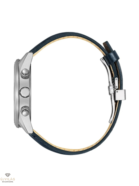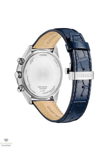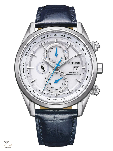 Elegáns rádióvezérlésű kronográf rozsdamentes acél tokkal és sötétkék bőrszíjjal, kristályüveggel és fehér számlapon. Felszerelve a H800-as kaliberrel, Eco-Drive teljesítményfunkcióval, rádiós vétellel, világidővel, stopperóra funkcióval, 24 órás kijelzővel, dátummal és 10 bar vízállósággal. A tok átmérője: 43 mm, a szíjperem szélessége: 22 mm.